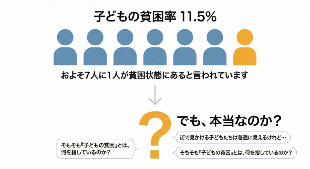 昨今では【子どもの貧困率11.5%】というフレーズがよく使われます。これに合わせて「子どもの7人にひとりが貧困である」というようにセンセーショナルな言葉が使われることを目にします。