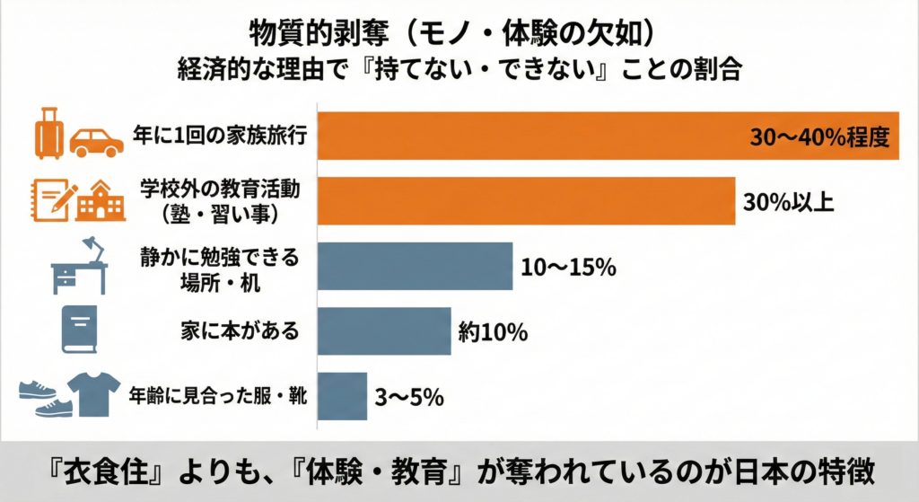 これは内閣府の調査などで補助的に用いられる指標で「生活必需品や経験が欠けているか」という実態に着目した定義です。以下の項目のうち「経済的な理由で持っていない、あるいはできない」項目がいくつかある場合に貧困に該当するとされています。