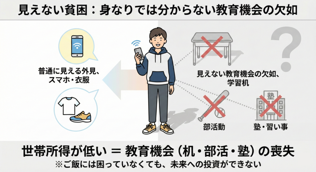 家庭毎の価値観によるものもあり、子どもにすべてを与えられなくとも貧困世帯に見えないような身なりを整えることを無理に優先する家庭もあるため「見えない貧困」であるケースも珍しくありません。