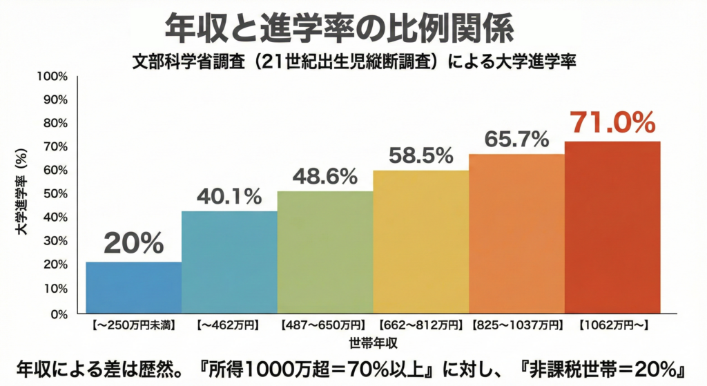 「住民税非課税世帯ですと20%」「所得1000万円以上の世帯ですと70%以上」という差が生まれています。